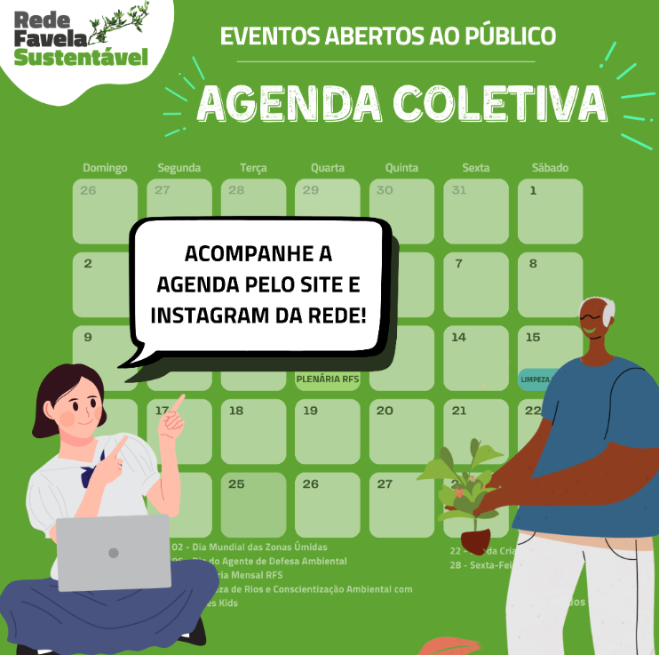 A Agenda Coletiva da Rede Favela Sustentável é um espaço colaborativo para reunir e divulgar ações e eventos de projetos integrantes. O objetivo é facilitar o compartilhamento de informações e fortalecer o engajamento entre nós, organizações, mobilizadores comunitários e aliados técnicos integrantes da RFS.